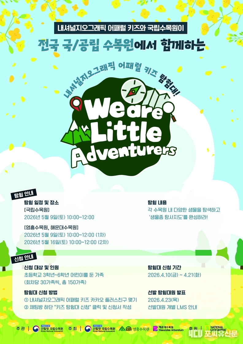 참여 신청은 ‘내셔널지오그래픽 어패럴 키즈’ 카카오 플러스 친구를 추가한 후 채팅방 하단의 ‘키즈탐험대 신청’ 메뉴에서 가능하다. 신청 기간은 4월 10일(금)부터 4월 21일(화)까지이며, 선발된 최종 참가자는 4월 23일(목) 개별 문자(LMS)로 안내한다.