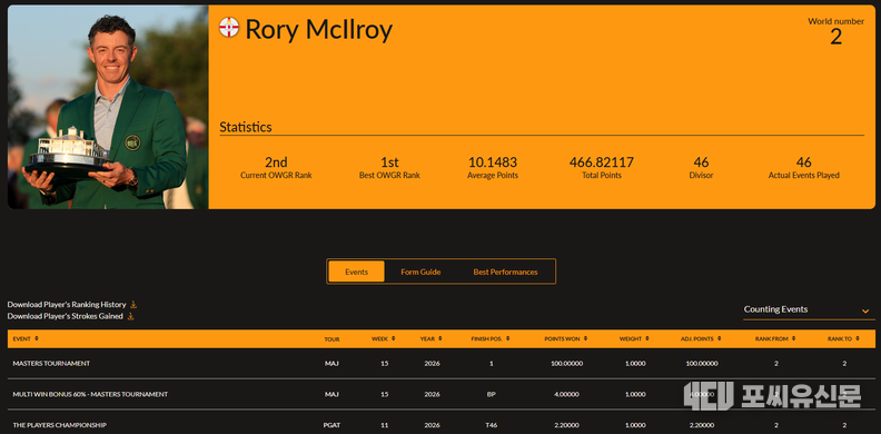 [포씨유신문=김대중 기자] 2026년 시즌 첫 번째 메이저 대회인 ‘마스터스 토너먼트’의 거센 후폭풍이 세계 골프 랭킹(OWGR)을 뒤흔들었습니다. 오거스타 내셔널의 주인공들이 랭킹 상단에 대거 포진하며 진정한 왕좌의 게임이 시작되었습니다.