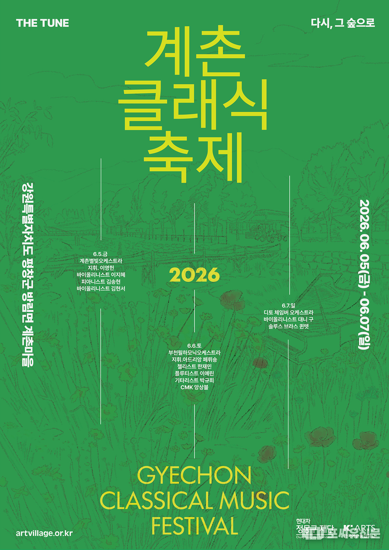 [포씨유신문=박윤희 기자] 현대차 정몽구 재단이 주최하고 한국예술종합학교가 주관하며 강원특별자치도 평창군이 함께하는 ‘계촌 클래식 축제’가 6월 5일부터 7일까지 3일간 계촌클래식마을에서 열린다.