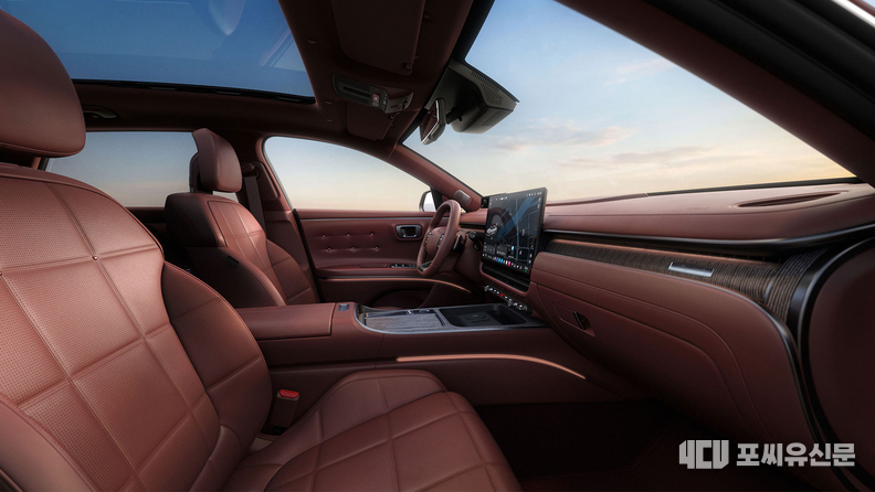 도어 트림에는 ‘카우치 패턴’이 적용돼 촉각적 안락함을 제공하며 은은한 간접조명이 프리미엄 라운지 분위기를 조성한다. 투명과 불투명 상태를 전동 조절할 수 있는 ‘스마트 비전 루프’는 실내 개방감을 강화했다.